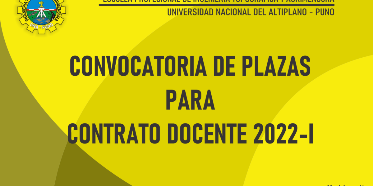 UNIVERSIDAD NACIONAL DEL ALTIPLANO FACULTAD DE CIENCIAS AGRARIAS ESCUELA PROFESIONAL DE INGENIERÍA TOPOGRÁFICA Y AGRIMENSURA CONVOCATORIA DE PLAZAS PARA CONTRATO DOCENTE 2022-I PARA MAS INFORMACION CLICK AQUI Fuente: Departamento Académico EPITA