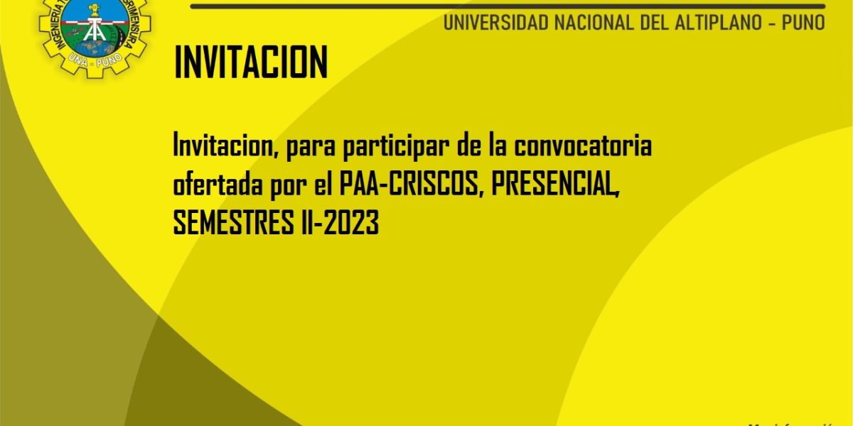 INVITACION PARA EL PAA-CRISCOS, PRESENCIAL, SMESTRE II-2023 Marco Antonio Quispe mayo 2, 2023mayo 2, 2023 Educación, Institucional UNIVERSIDAD NACIONAL DEL ALTIPLANO PUNO FACULTAD DE CIENCIAS AGRARIAS ESCUELA PROFESIONAL DE INGENIERÍA TOPOGRÁFICA Y AGRIMENSURA INVITACION PARA EL PAA-CRISCOS, PRESENCIAL, SMESTRE II-2023 Leer más
