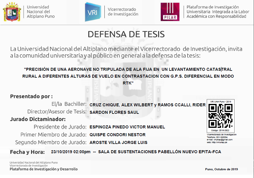 «PRECISIÓN DE UNA AERONAVE NO TRIPULADA DE ALA FIJA EN UN LEVANTAMIENTO CATASTRAL RURAL A DIFERENTES ALTURAS DE VUELO EN CONTRASTACION CON G.P.S. DIFERENCIAL EN MODO RTK» Fuente: Plataforma PILAR UNA-Puno Quieres saber mas sobre los tramites para obtención de grados, requisitos para los mismos y demás actividades accede al siguiente enlace