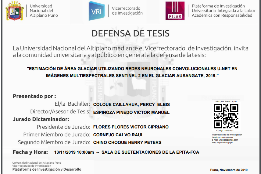 «ESTIMACIÓN DE ÁREA GLACIAR UTILIZANDO REDES NEURONALES CONVOLUCIONALES U-NET EN IMÁGENES MULTIESPECTRALES SENTINEL 2 EN EL GLACIAR AUSANGATE, 2019.» Fuente: Plataforma PILAR UNA-Puno Quieres saber mas sobre los tramites para obtención de grados, requisitos para los mismos y demás actividades accede al siguiente enlace