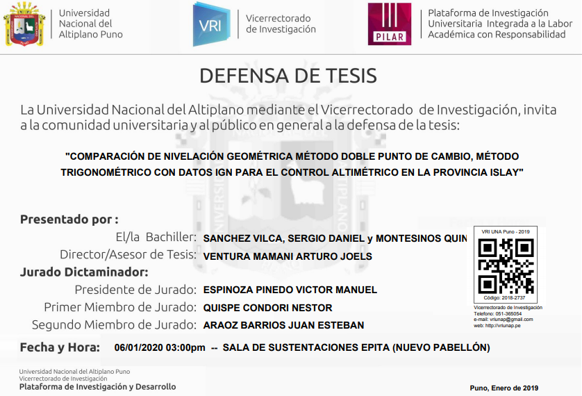 «COMPARACIÓN DE NIVELACIÓN GEOMÉTRICA MÉTODO DOBLE PUNTO DE CAMBIO, MÉTODO TRIGONOMÉTRICO CON DATOS IGN PARA EL CONTROL ALTIMÉTRICO EN LA PROVINCIA ISLAY» SANCHEZ VILCA, SERGIO DANIEL y MONTESINOS QUINCHO, CLAUDIA Fuente: Plataforma PILAR UNA-Puno Quieres saber mas sobre los tramites para obtención de grados, requisitos para los mismos y demás actividades accede al siguiente enlace