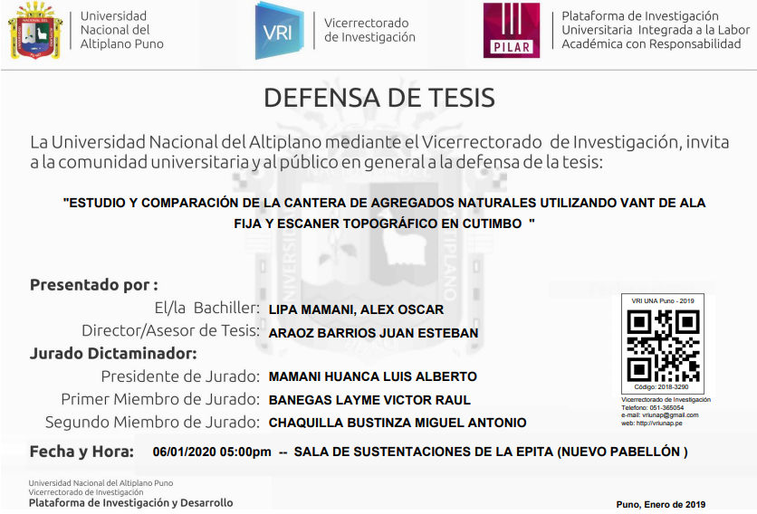 «ESTUDIO Y COMPARACIÓN DE LA CANTERA DE AGREGADOS NATURALES UTILIZANDO VANT DE ALA FIJA Y ESCANER TOPOGRÁFICO EN CUTIMBO» LIPA MAMANI, ALEX OSCAR Fuente: Plataforma PILAR UNA-Puno Quieres saber mas sobre los tramites para obtención de grados, requisitos para los mismos y demás actividades accede al siguiente enlace