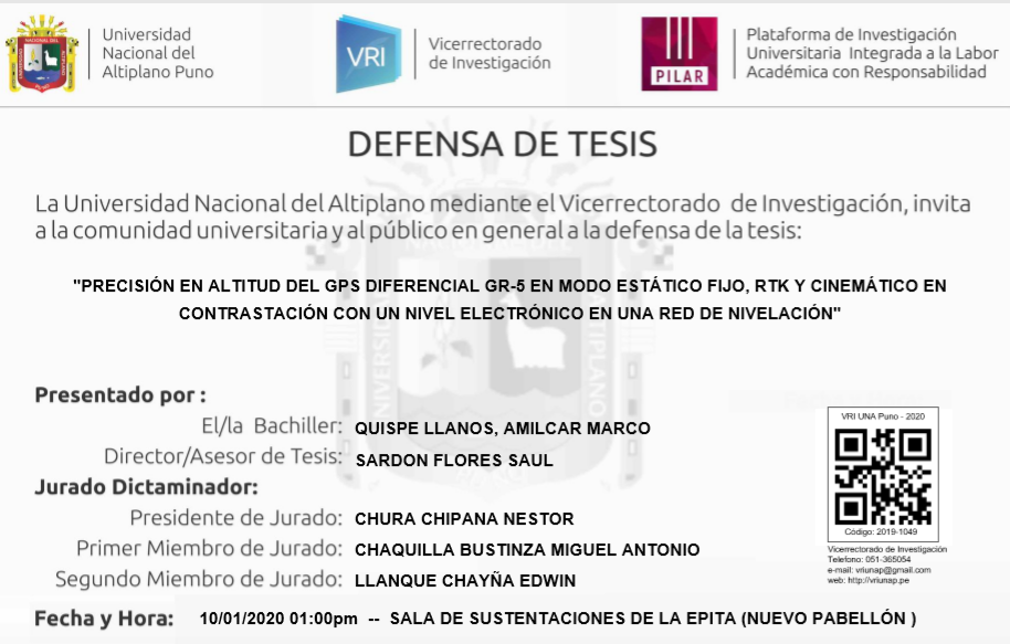 «PRECISIÓN EN ALTITUD DEL GPS DIFERENCIAL GR-5 EN MODO ESTÁTICO FIJO, RTK Y CINEMÁTICO EN CONTRASTACIÓN CON UN NIVEL ELECTRÓNICO EN UNA RED DE NIVELACIÓN» QUISPE LLANOS, AMILCAR MARCO Fuente: Plataforma PILAR UNA-Puno Quieres saber mas sobre los tramites para obtención de grados, requisitos para los mismos y demás actividades accede al siguiente enlace