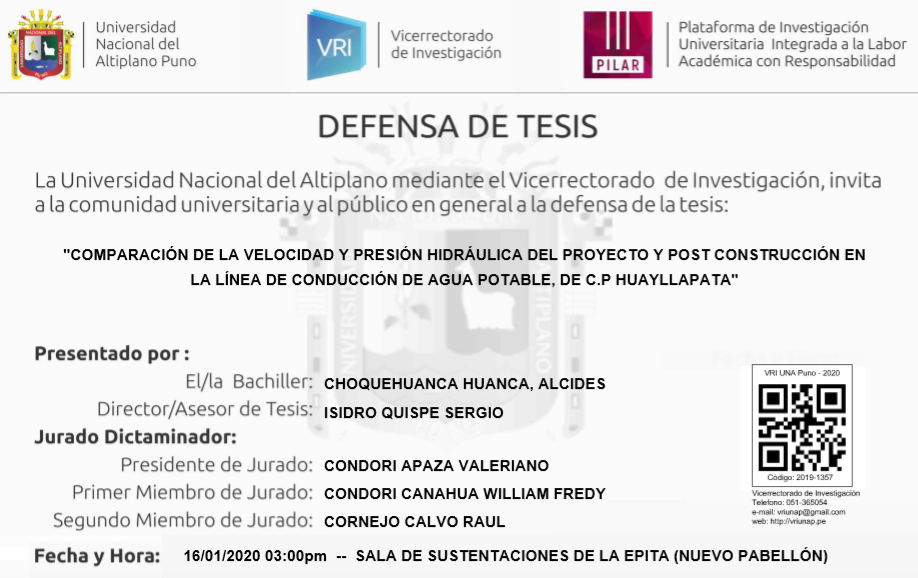 «COMPARACIÓN DE LA VELOCIDAD Y PRESIÓN HIDRÁULICA DEL PROYECTO Y POST CONSTRUCCIÓN EN LA LÍNEA DE CONDUCCIÓN DE AGUA POTABLE, DE C.P HUAYLLAPATA» CHOQUEHUANCA HUANCA, ALCIDES Fuente: Plataforma PILAR UNA-Puno Quieres saber mas sobre los tramites para obtención de grados, requisitos para los mismos y demás actividades accede al siguiente enlace