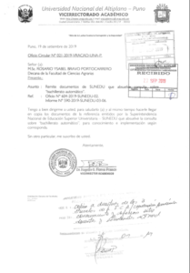 OFICIO CIRCULAR N° 021-2019-VRACAD-UNA-P.
